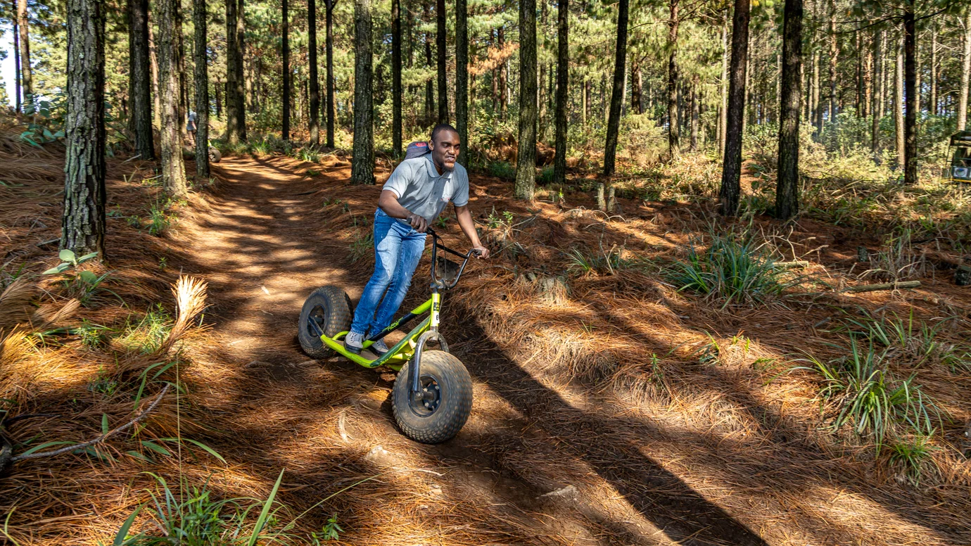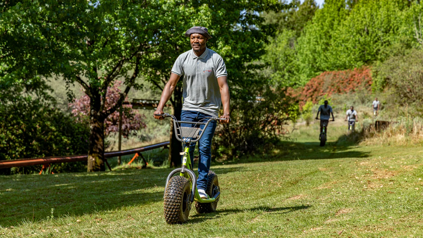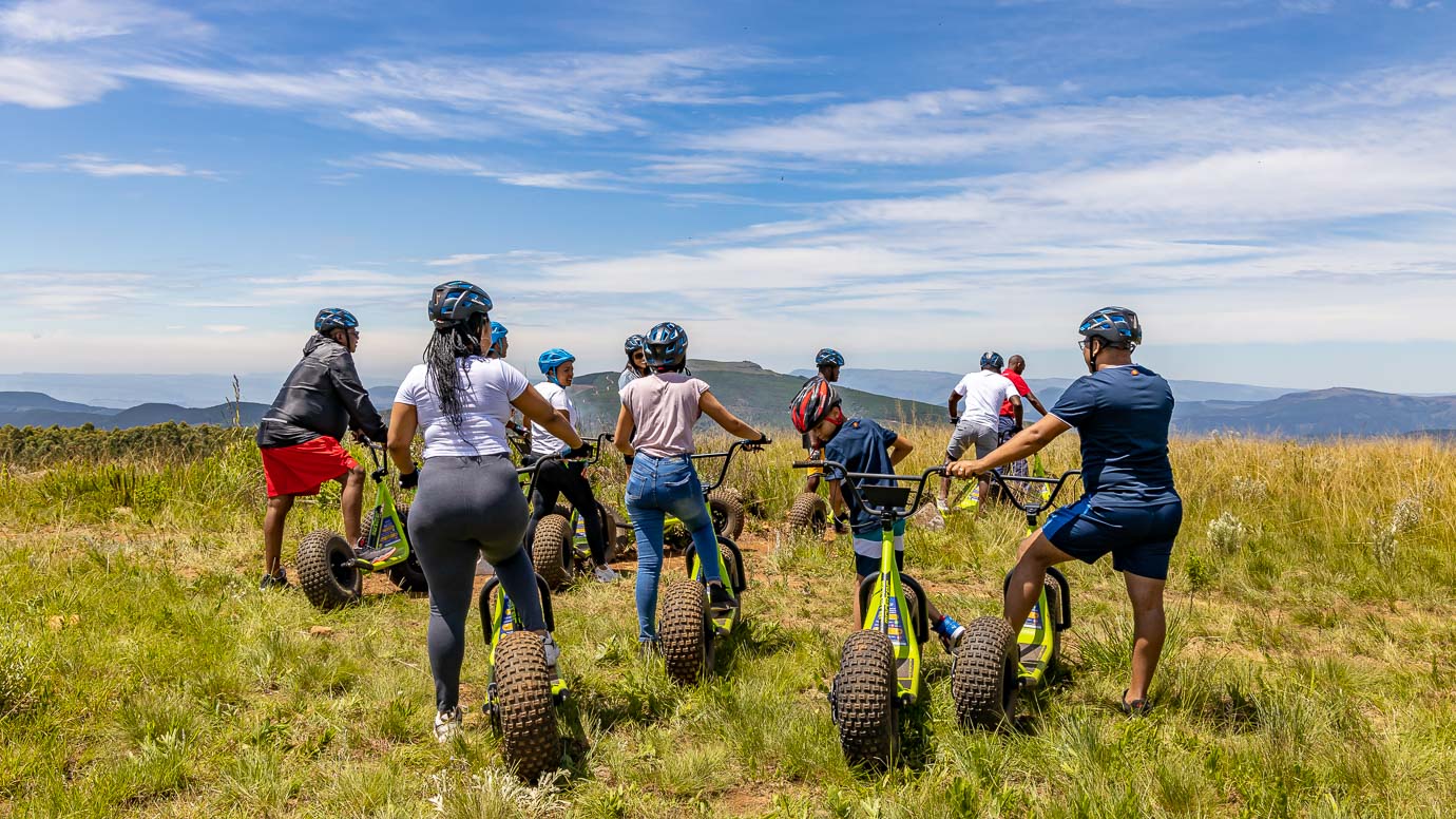 If you can ride a bicycle, you can ride a scooter! This is a unique experience of sensational downhill runs in the mountains of the Long Tom Pass. Starting at an altitude of 1765 metres above sea level on a Monster Scooter, single track through grasslands, patches of indigenous forest and vast pine plantations. The scooters are non-motorized, making this an eco-friendly adventure.